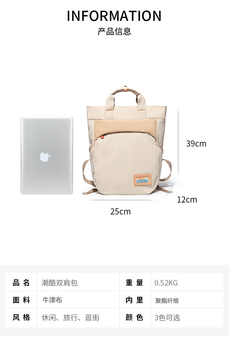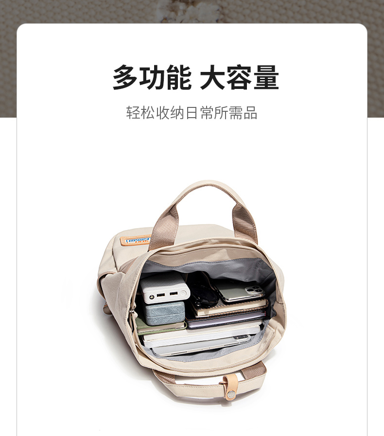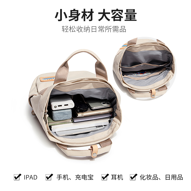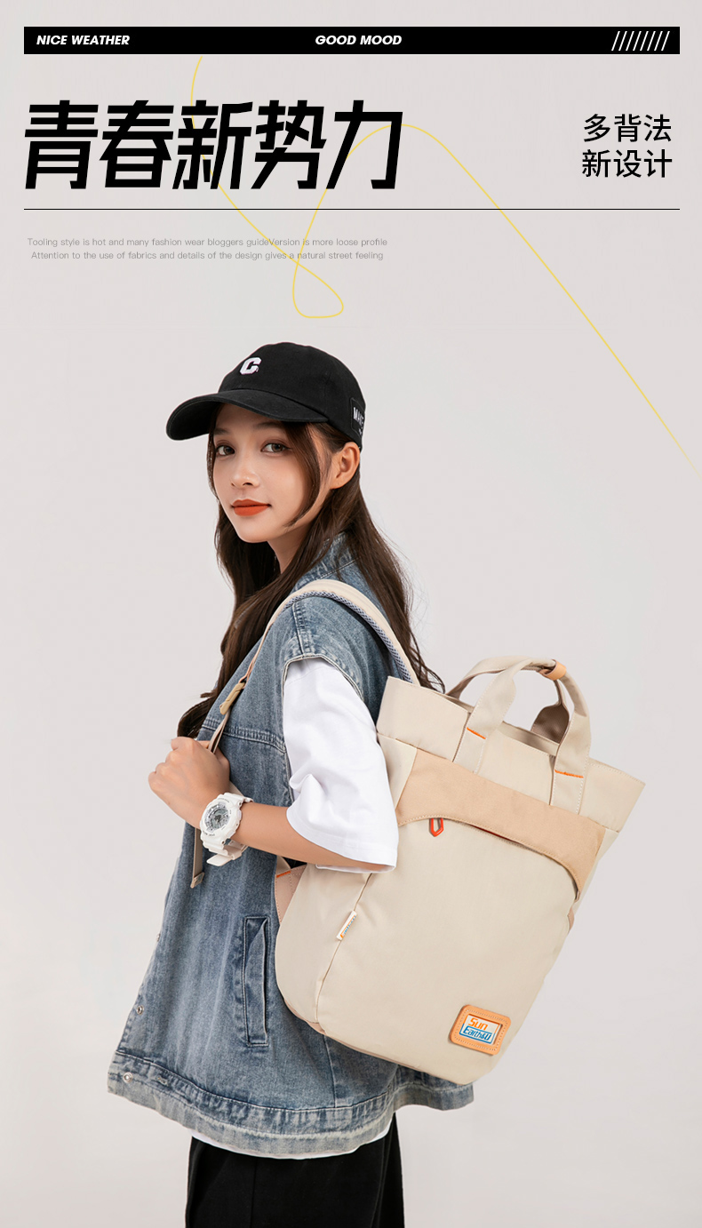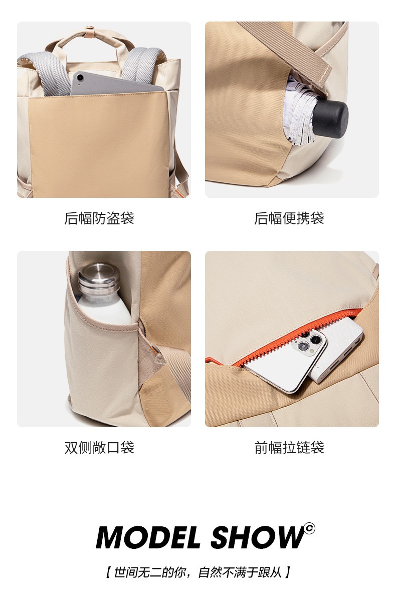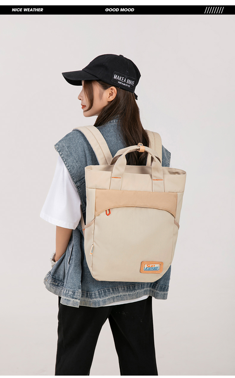 Suncamp DayHike 多功能休闲双肩包 无论是日常通勤、城市漫步,还是户外轻徒步,Suncamp DayHike 双肩包都能完美适配你的多元生活场景。整体设计简约清新,采用大地色调与撞色拉链点缀,展现自然户外风格的同时不失时尚感。可手提可双肩背的多用设计,让你轻松应对不同出行需求。 包身采用耐磨防泼水面料,内部空间充足,轻松容纳平板、书本、移动电源等日常用品,多功能隔层让物品井井有条。背部透气减压设计,长时间背负也依旧舒适。 产品特点: 大容量主仓设计,轻松收纳日常所需 双肩背 & 手提两用,灵活百搭 多色可选,满足不同穿搭风格 适用于通勤、学生、短途出行及轻徒步等多种场景 选择 Suncamp DayHike,在城市与自然之间自在穿行。