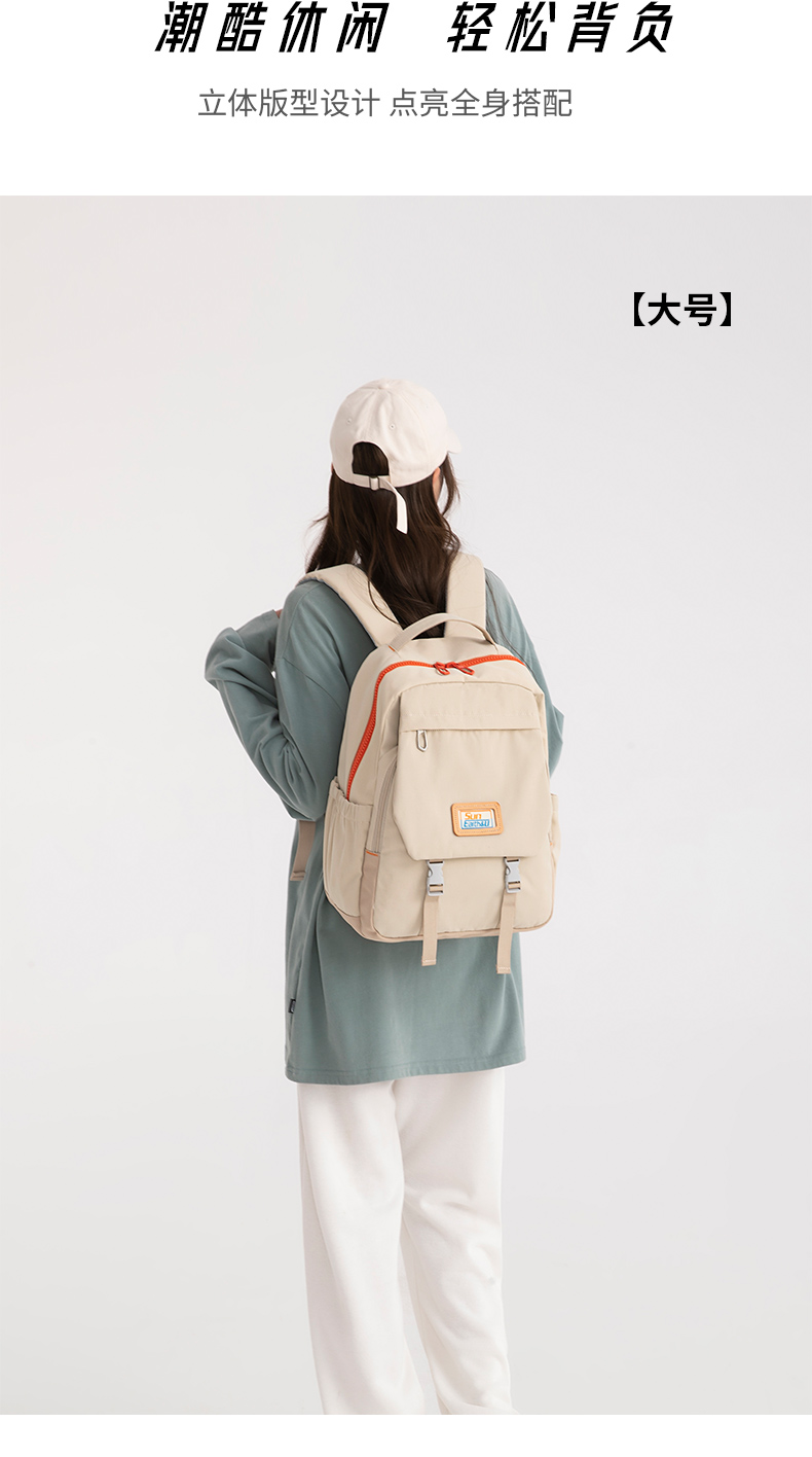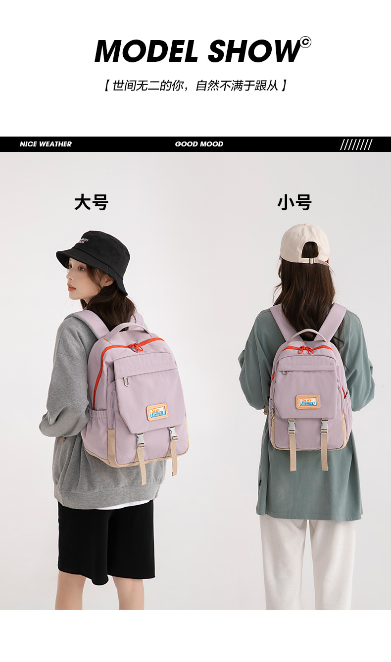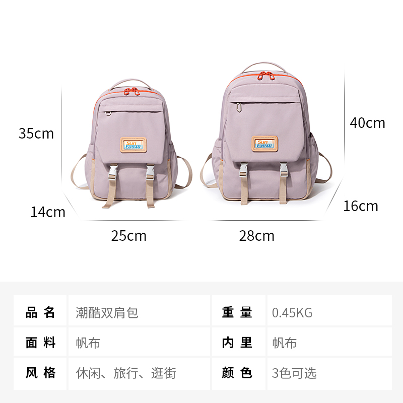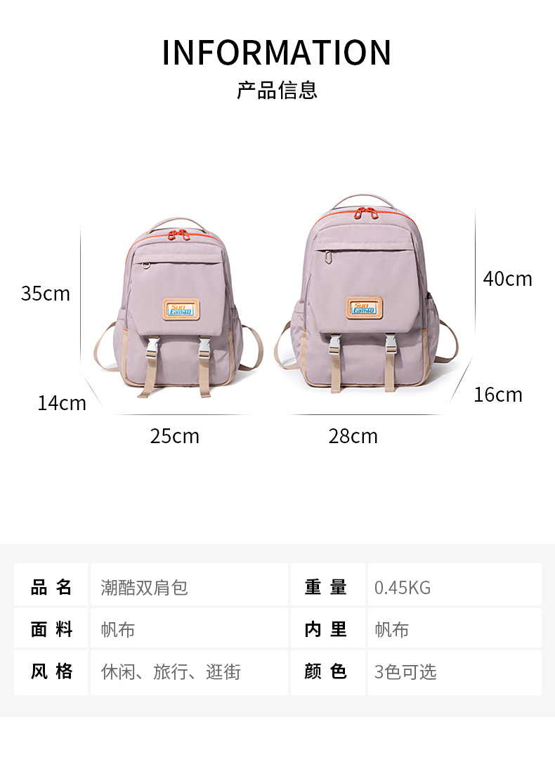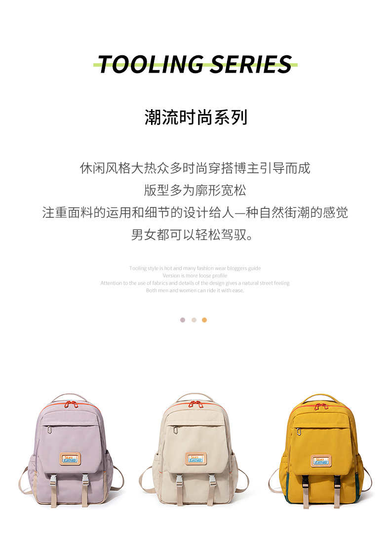 三种清新配色(淡紫、米白、姜黄)任你选择,搭配醒目的撞色拉链设计,细节感满满,男女皆宜。重量仅0.45kg,长时间背负也无负担,是你不可或缺的潮流搭档。