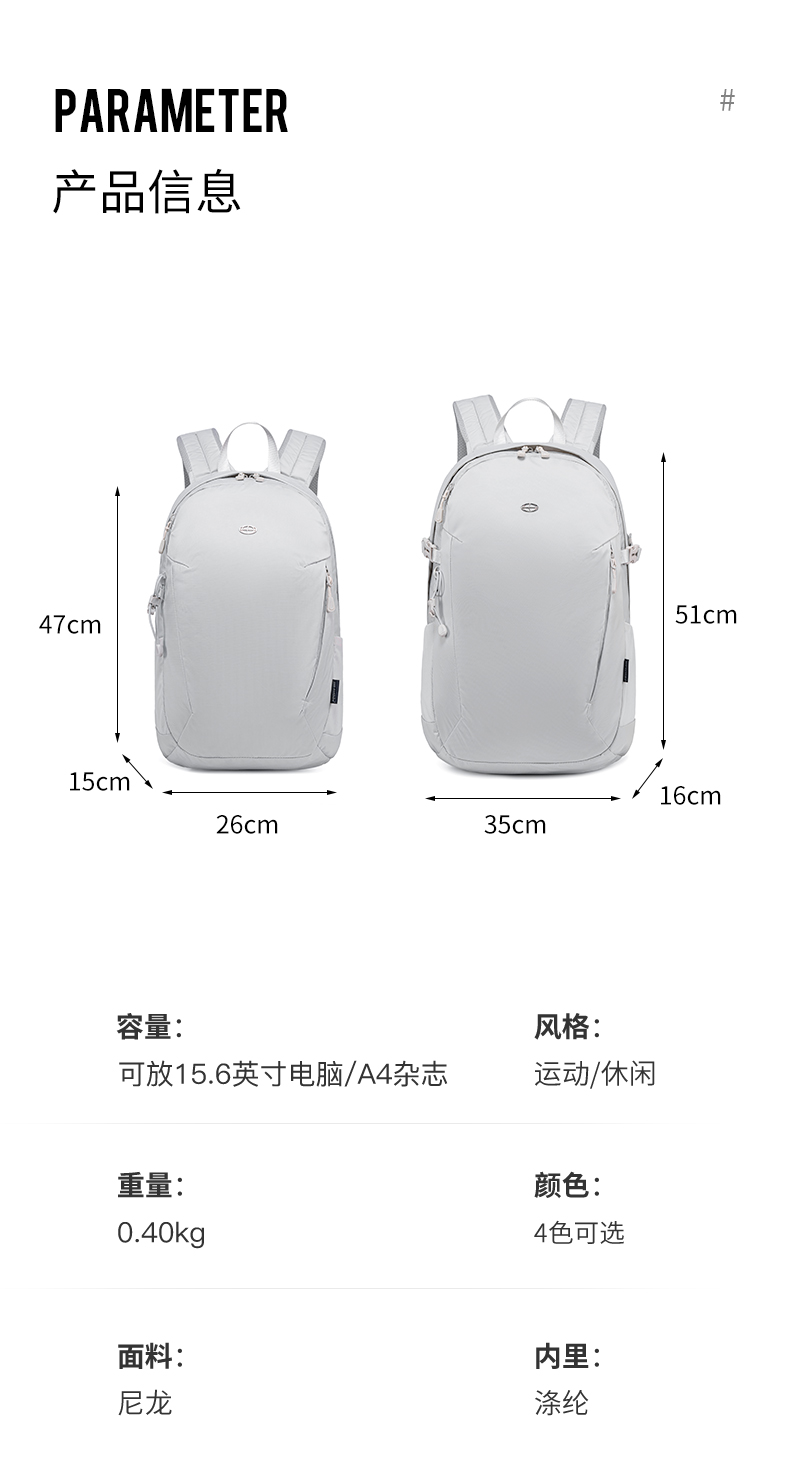 Mova Lite 摩瓦轻行|轻而强大,随行无忧 轻,是它的本能;走,是你的节奏。 Mova Lite 摩瓦轻行双肩包,专为都市与户外自由切换而设计。整包自重轻盈,减负不减容,真正实现“轻装上阵”。不论是地铁通勤、城市骑行,还是山野徒步、周末短途出行,它都能成为你最可靠的出行搭档。 三大核心亮点: 轻盈便携:精选轻质耐磨面料,整包净重控制出色,长时间背负无压感。 多场景适配:专业背负系统,兼顾通勤所需的稳重感与户外运动的灵活性。 科学收纳:主仓大容量设计,配有笔电夹层与多功能口袋,满足日常与短途所需。 无论你走在城市街头,还是穿行山林之间,Mova Lite 摩瓦轻行,让每一步都轻松自如,自在随行。 小号:168.00元 大号:189.00元